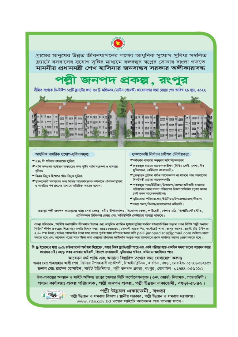 গত ১৬ জুন ২০২২ খ্রি. তারিখে মাানীয় প্রধানমন্ত্রী শেখ হাসিনা ভিডিও কনফারেন্স এর মাধ্যমে রংপুর বিভাগের পল্লী জনপদ ভবন শুভ উদ্বোধন করে ফ্লাট গ্রহীতাদের মাঝে চাবি হস্তান্তর করেন।